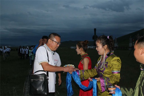 康總接受熱情的蒙古族人民敬獻(xiàn)的馬奶酒和哈達(dá)