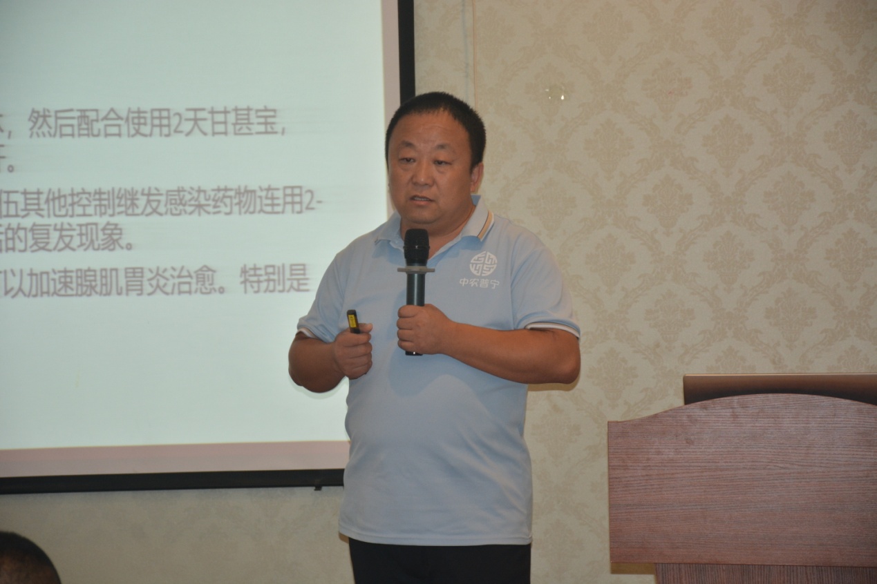 接下來,公司技術總監(jiān)王金紀帶來了《當下產品調整與年內獸藥發(fā)展出路》的技術報告。王總介紹了當前公司產品的架構,分析了目前獸藥行業(yè)面臨的問題,同時基于公司未來的發(fā)展,王總給出了公司產品接下來的研發(fā)方向,只有緊跟市場,不斷推陳出新,才能始終保持公司產品的市場競爭力。